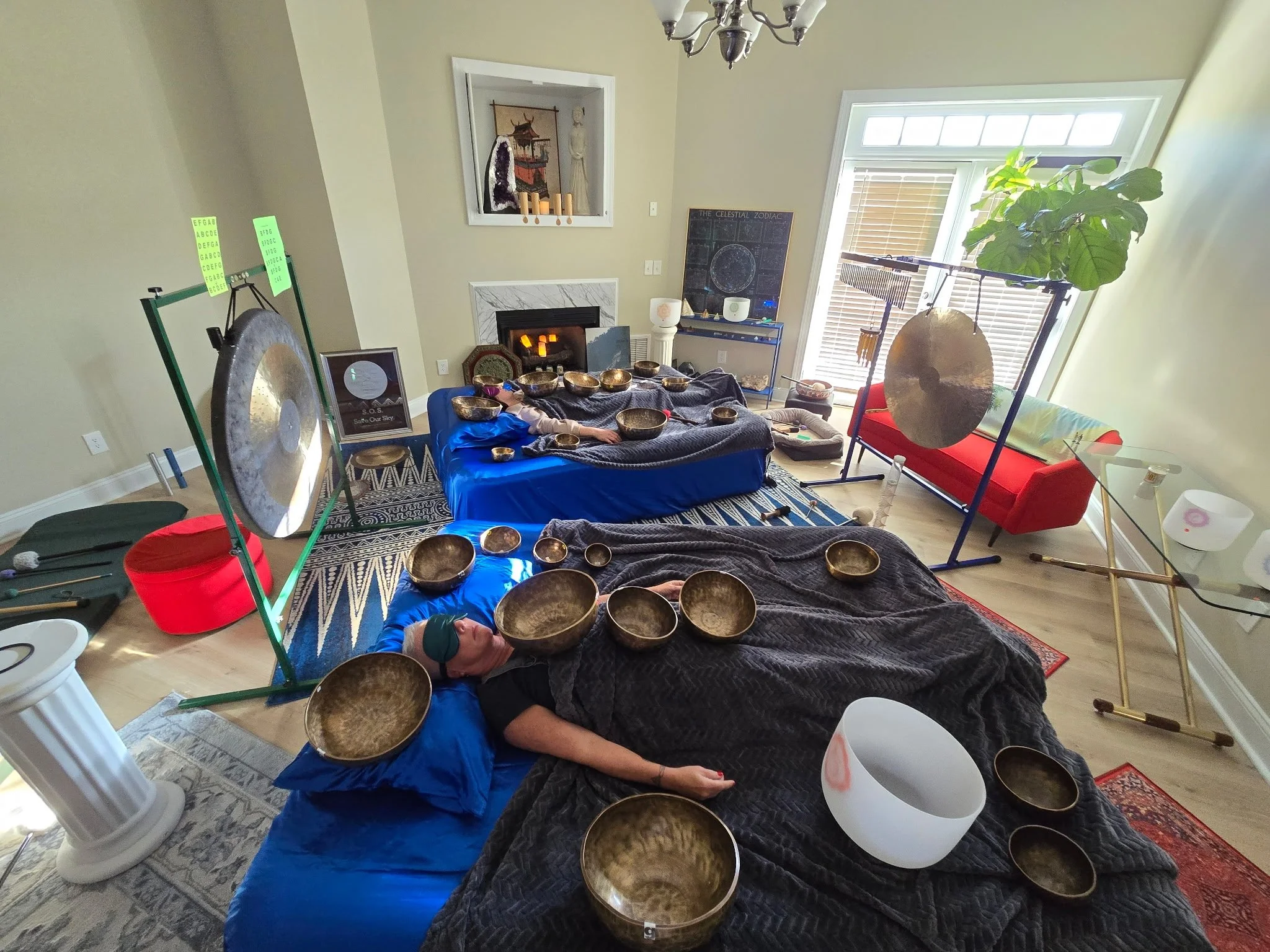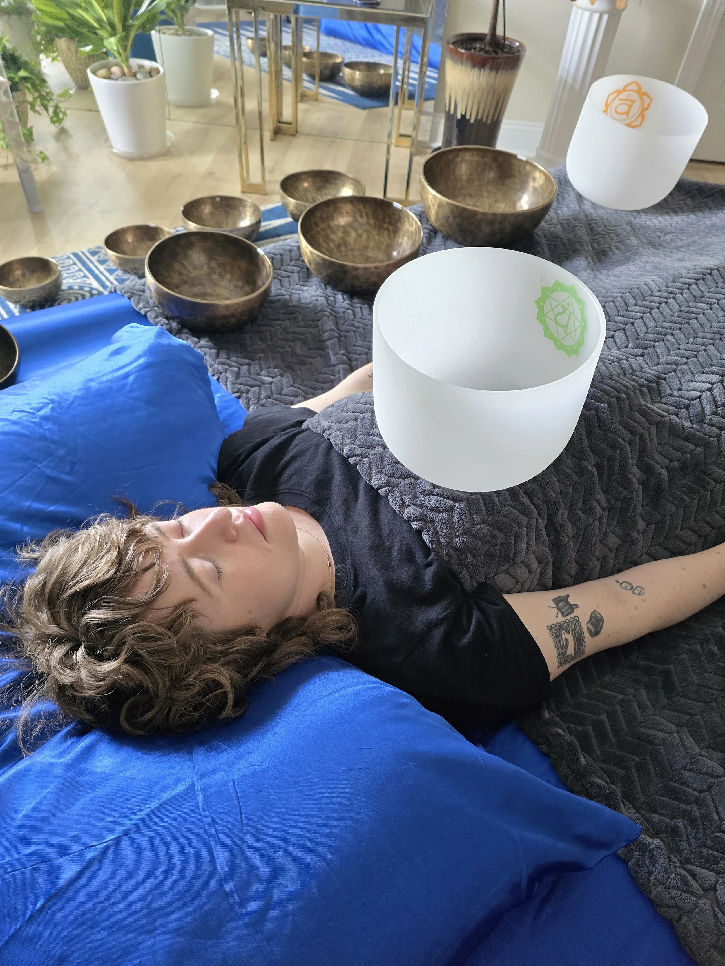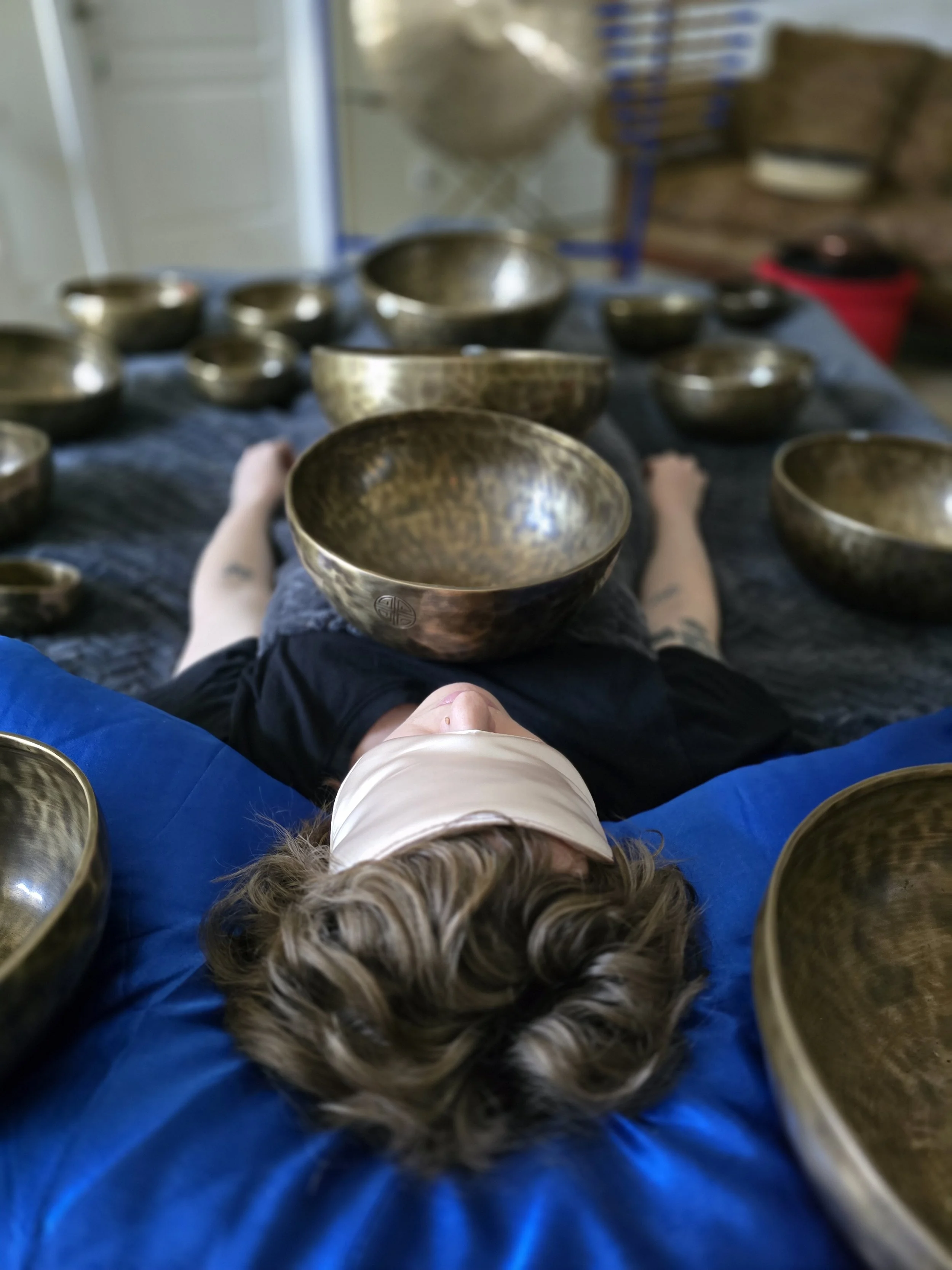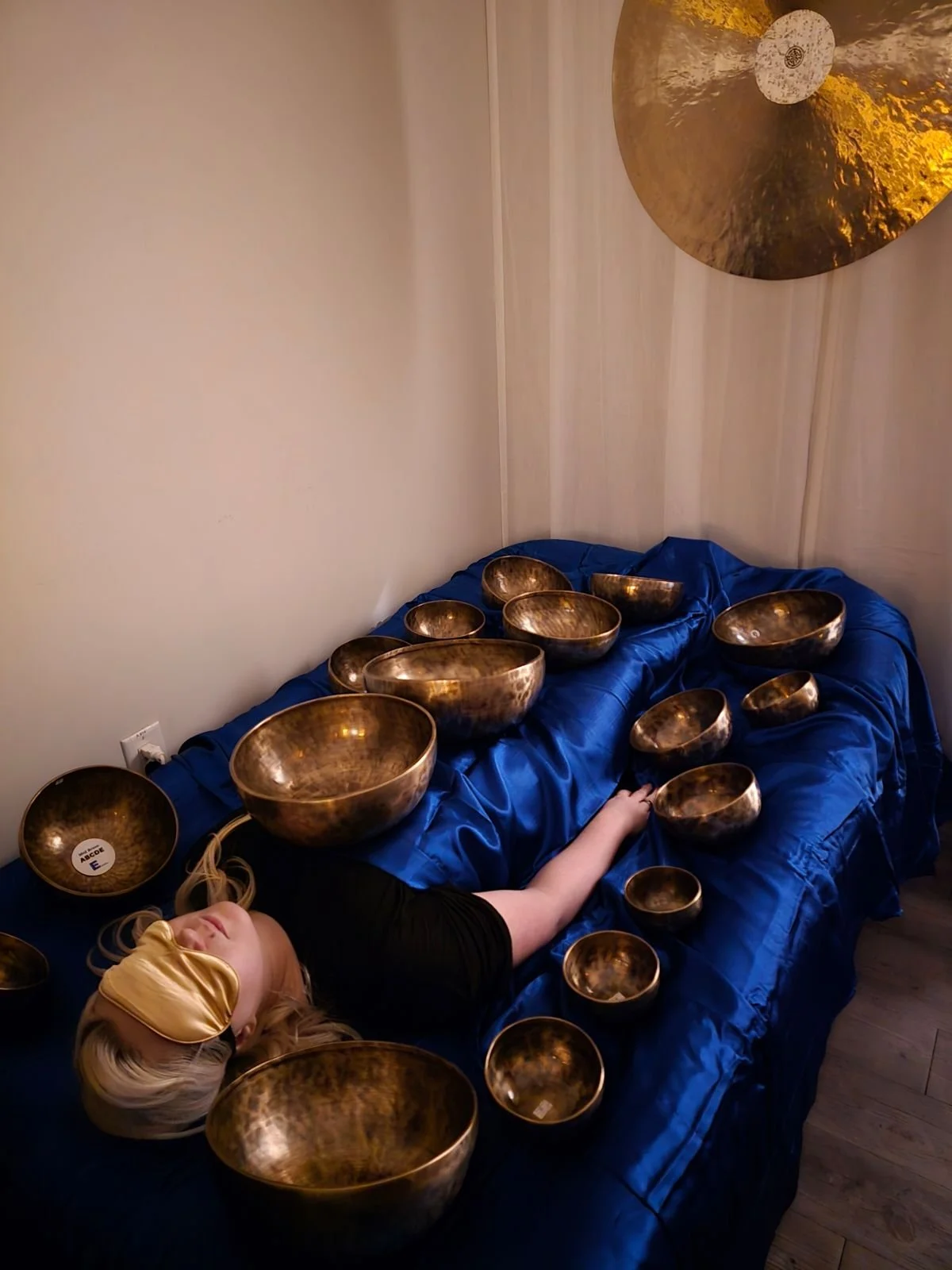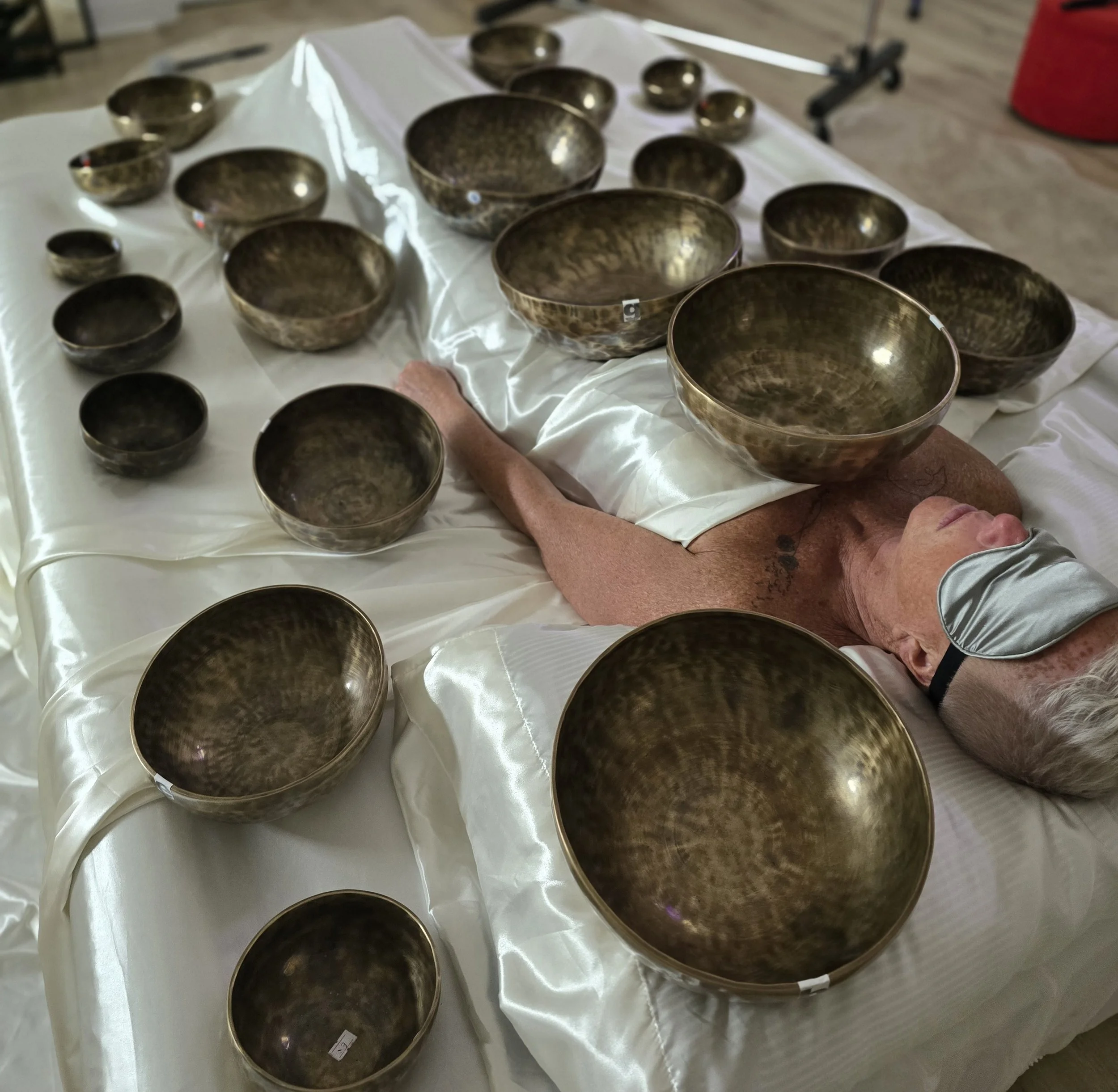 Over 20 hand-hammered Nepalese singing bowls are placed around and directly on the body to promote full-body resonance and vibrational healing.